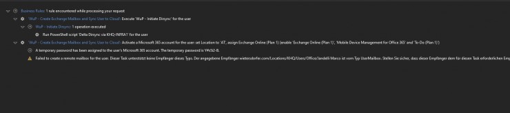For now I'm just creating a mailbox (with the default business rule), run a dirsync with CloudAD and after that I activate the MS 365 account and assign location and license. Unfortunately the website is half-german however. Running the business rule, following error is showing up: 2022-04-07 12_24_49-Human Resources - Austria — Mozilla Firefox.png