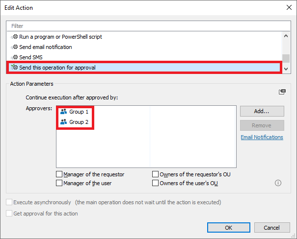 So I need an approval process before adaxes executes a custom command to create a user. Basicaly an HR group and a Privacy group have to approve. what i have is set up like this: First Approval goes out but the second one waits until the first one has been approved. I want them to go out at the same time.
