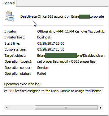 Now if I run across a user who still has a license assigned, i'm receiving an error (see attached). The "Unable to assign license" makes me scratch my head a bit since you can tell from the activity that the task is configured to Deactivate the license.