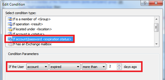if 'Account Expires' property is less than equal to '%datetime,+2d%' then .....