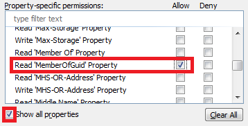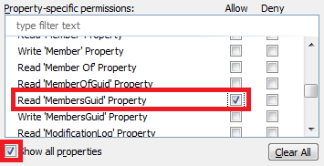 Select the Read 'MembersGuid' Property and Read 'DirectMembersGuid' Property permissions in the Property-specific permissions section.