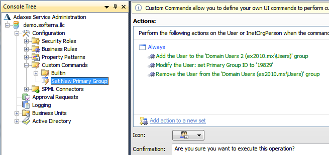 • Add the user to the new primary group (using the standard Add to Group action)