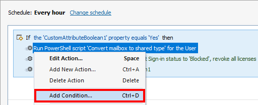 - Now, you need to add a condition when the script will be executed. Right-click the action that you've just added and select Add Condition.
