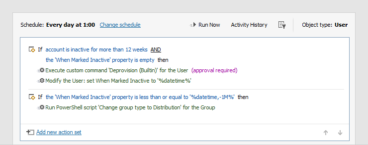 The great thing about Adaxes is that it doesn’t limit you to the built-in functionality. You can basically do whatever you want with both the conditions that define inactive users and the actions that will be executed once stale accounts are identified.