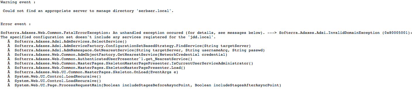 2. If the problem persists, please have a look at the Adaxes Event Log. Are there any errors related to publishing Adaxes service via the Service Connection Point?