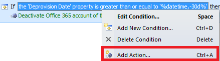 There is no need to delete the mailbox, you can simply revoke the Office 365 license 30 days after deprovisioning a user. To do so, you can use a Scheduled Task that will check user deprovision date and revoke all licenses if a user account was deprovisioned more than 30 days ago. The deprovision date can be specified in one of Adaxes custom attributes (e.g. CustomAttributeDate1). For example, your Deprovision Custom Command can look like the following: To create the Scheduled Task: