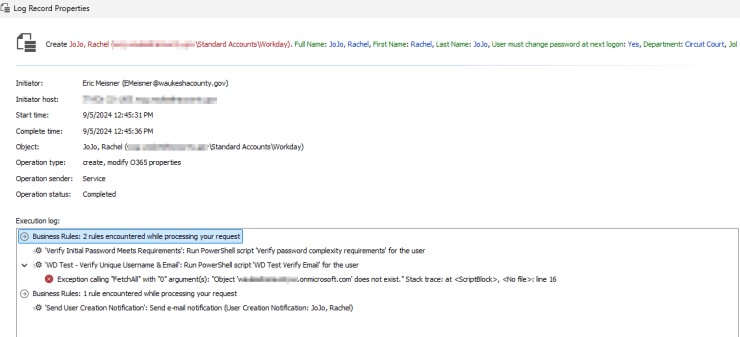 When the scheduled task runs to create the user via PowerShell, the user business process rule keeps throwing the following error: