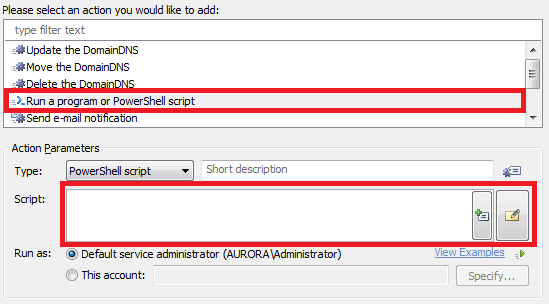 4. On the 4th step of the wizard, add the Run a program or PowerShell script action and paste the following script in the script field.
