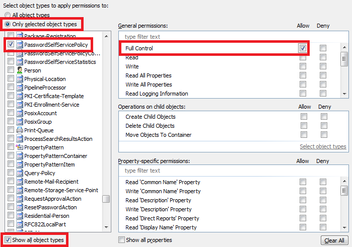 - To allow deleting Password Self-Service Policies, select the Delete Child Objects permission in the Allow column.