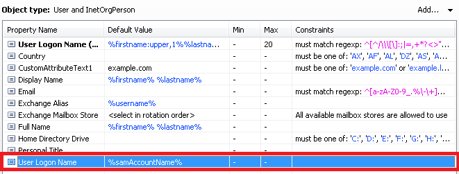 In the Generate default value field, type a pattern for generating the user logon name, for example: %sAMAccountName%@%adm-CustomAttributeText1%, where: