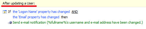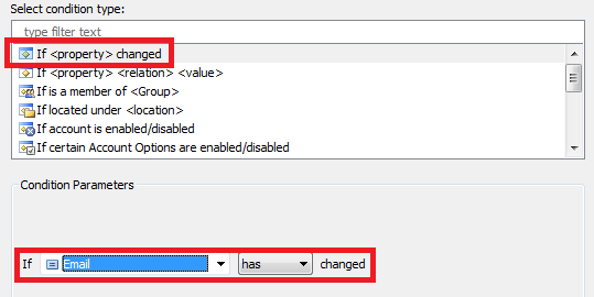 Another Business Rule triggered after updating a user will send the e-mail message. The old values for the properties will be taken from the Adaxes custom attributes that you used in the 1st Business Rule. The new values for the properties will be taken from their current values after the operation is complete.